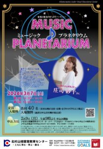 ~ミュージックプラネタリウム~ゲスト:シンガーソングライター「庄司紗千」さん 例年大好評の音楽とプラネタリウムのコラボレーション企画です。今回は特別ゲストとしてシンガーソングライターの「庄司紗千」さんをお招きします。音楽と星空のきらめくハー…