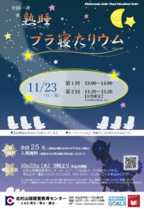 大人向け秋のプラネタリウム ~全国一斉 熟睡プラ寝たリウム~ 勤労感謝の日に、日頃お疲れぎみのみなさんを、快眠へと誘う特別投影です。プラネタリウムでリラックスしながら、音楽と星座物語に浸ります。 満天の星空で、心地よい音楽に耳を傾けながら、…
