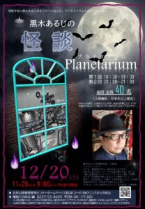 大人向け冬のプラネタリウム ~黒木あるじの怪談プラネタリウム~ 怪談作家の黒木あるじ氏をゲストに迎えた、プラネタリウムとのコラボレーション企画です。「怪談」と「プラネタリウム」の異色の組み合わせ。星空の下で語られる、摩訶不思議な世界をあなた…
